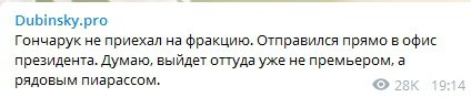 У свою чергу, нардеп Олександр Дубінський повідомив в Telegram, що Гончарук після оприлюднення у мережі запису з критикою президента, замість засідання поїхав до Зеленського.