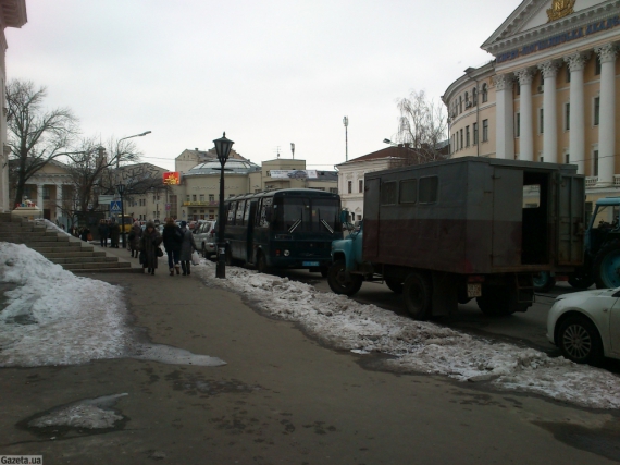 З іншого боку будівлі, біля дверей колишнього магазину одягу топчуться троє "беркутівців" у коричневих бронежилетах зі стертим написом "міліція" та з касками в руках.