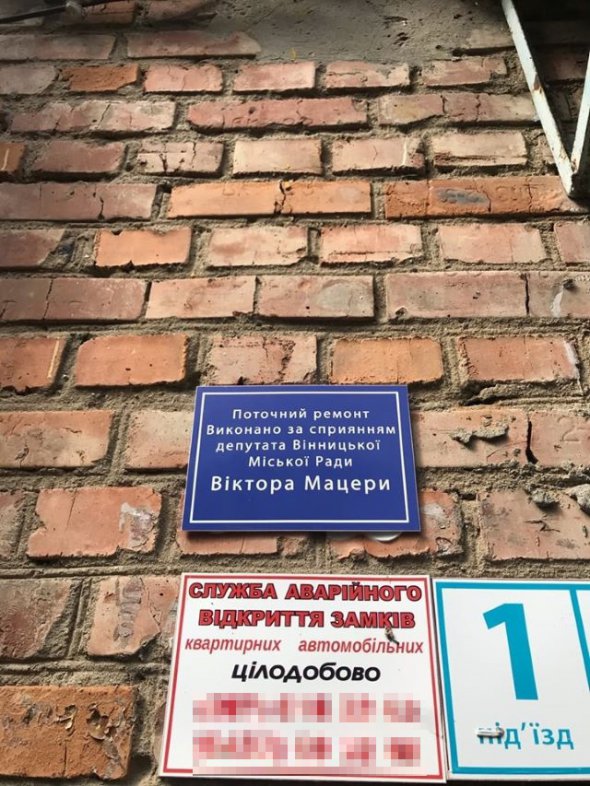 Також висить табличка на будинку із написом: "Поточний ремонт виконано за сприяння депутата Вінницької міської ради Віктора Мацери".