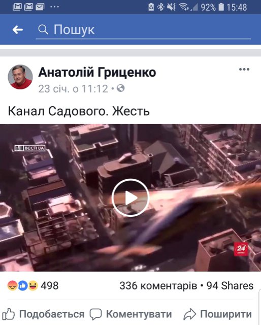 Кандидат в Президенти України, Анатолій Гриценко на власній сторінці у мережі Facebook поскаржився на інформаційні атаки, організовані Андрієм Садовим. Очільник партії "Громадянська позиція" запостив посилання на сюжет програми "ВестиUA", що вийшла на 24 каналі. Обурений політик написав коротко: "Канал Садового. Жесть!".