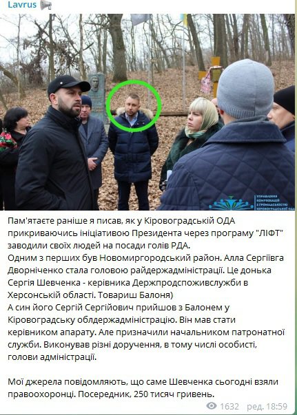 "Особою, близькою до голови облдержадміністрації Андрія Балоня", або посередником у ймовірній передачі хабаря в 250 тисяч гривень може бути начальник патронатної служби Сергій Шевченко", - у своєму Telegram-каналі написав голова ГО "Центральноукраїнський антикорупційний офіс" Андрій Лаврусь.