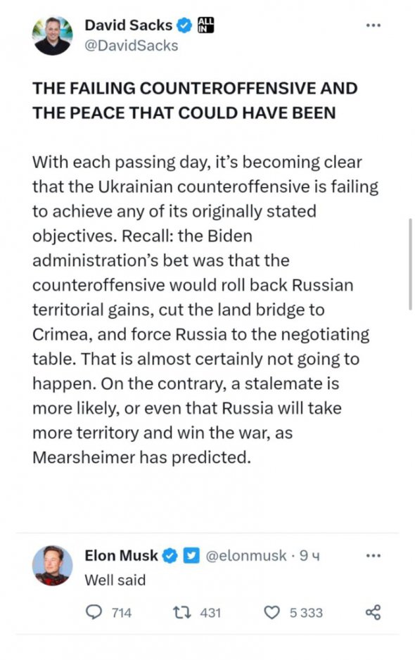 Генеральний директор компаній SpaceX і Tesla зганьбився, підтримавши у Twitter допис бізнесмена та інвестора Девіда Сакса про нібито провал контрнаступу Збройних сил України. Сакс опублікував розлогий твіт, де заявив, що український контрнаступ не досягає жодної із поставлених цілей.