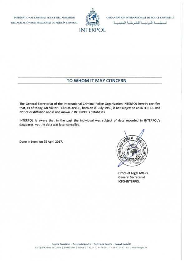 Інтерпол документально підтвердив, що зняв з розшуку колишнього президента Віктора Януковича.