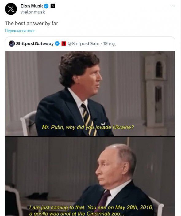 Американський мільярдер опублікував у Twitter мем, у якому скандальний ексведучий Fox News Такер Карлсон нібито запитує Путіна, чому РФ вторглася в Україну: