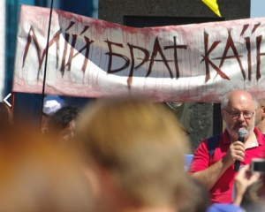 Колона мітингувальників рушила від Міністерства оборони до адміністрації президента. Учасники мітингу вимагають вжити заходів із розблокування українських силовиків, які потрапили в оточення в Іловайську, а також надати добровольчим батальйонам важке озброєння і бойову техніку.