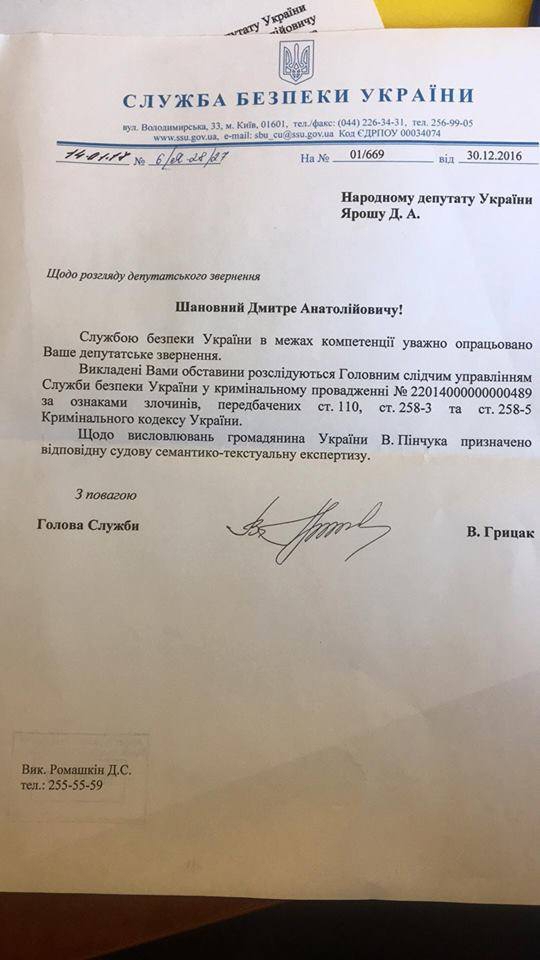 Про це свідчить відповідь глави СБУ Василя Грицака на депутатське звернення нардепа Дмитра Яроша.