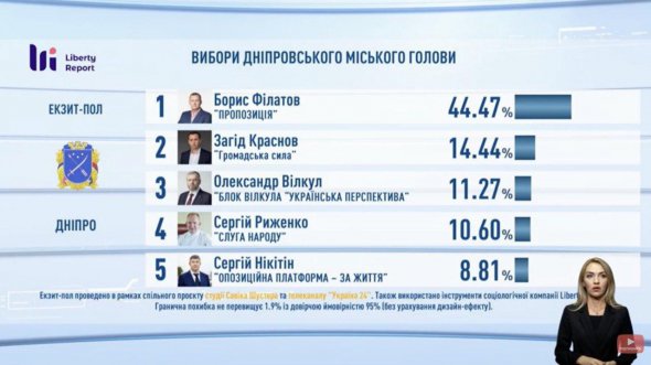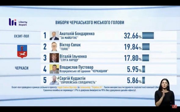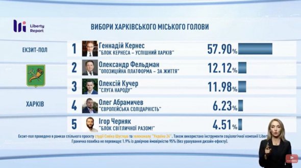 За даними екзитполу, який оприлюднили у програмі Савіка Шустера на телеканалі "Україна 24", у Львові, Дніпрі, Харкові, Одесі, Черкасах, Маріуполі лідирують діючі мери.