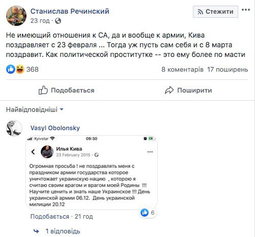 Інші користувачі звинуватили Киву в політичній проституції та запропонували почати відзначати 8 березня, до якого він має таке ж відношення, як і до Радянської армії.