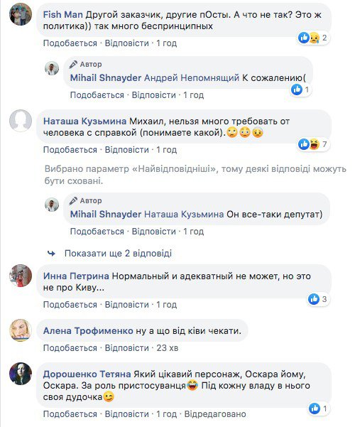"Схоже, у нас з'явився новий чемпіон з перевзування в повітрі. І це наш знаменитий Ілля Кива. Який примудрився відредагувати свою публікацію аж... за 2015 рік... Просто приклад "принциповості" і "послідовності". Ну, а якщо говорити серйозно, то все це виглядає просто жалюгідно", - написав Михайло Шнайдер.