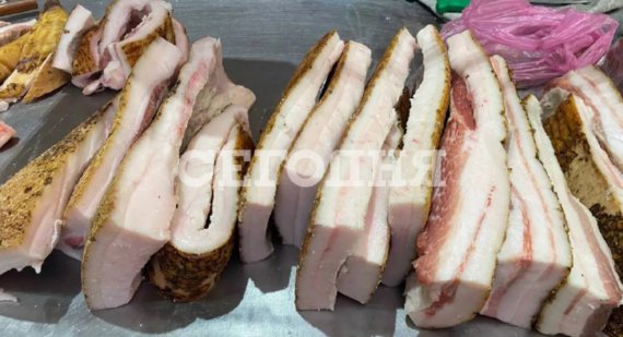 Жінки показали шматки сала. Ціни варіюють від 150 до 500 грн за кілограм. Тищенко, кажуть продавчині, купує український делікатес по 250 грн.