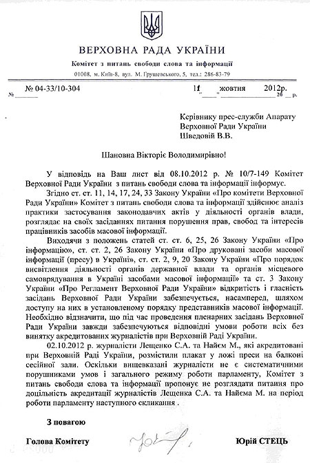 Про це йдеться у листі комітету Юрія Стеця до керівника прес-служби апарату Верховної Ради Вікторії Шведової, пише "Українська правда".