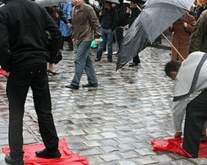 Також тут же активісти підпалили червоний прапор. Іще кілька комуністичних стягів розкидали просто на асфальті. Мітингувальники витирають об них ноги.