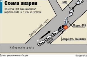 Як стало відомо "Сегодня", минулої п"ятниці о 9.50 ранку кортеж прем"єра Юлії Тимошенко з 5 машин потрапив в аварію на Дніпровському спуску, на його нижньому відрізку (приблизно там же, де в 2002 році потрапила в ДТП і отримала струс мозку сама Ю.В.Т.). Кортеж (без особи, що охороняється, тобто Тимошенко) мчався на високій швидкості з боку Набережного шосе і повернув вгору по Дніпровському спуску. Попереду йшла, як і належить, машина супроводу ДАІ. Причому у неї були включені мигалки червоного кольору (про це заявив начальник ДДАІ МВС України генерал Сергій Коломієць). Зверху спускався БМВ-"трійка".