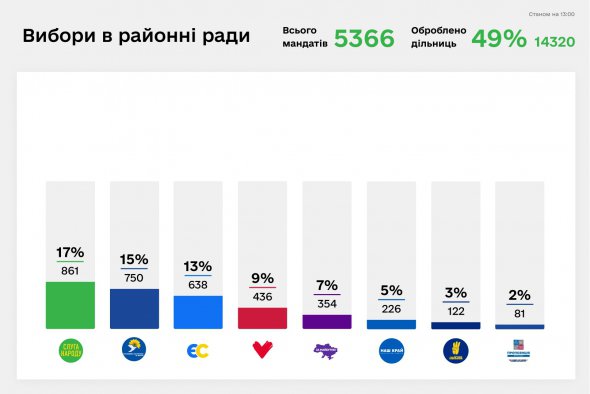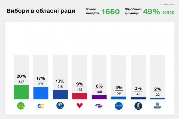 За його словами, після обробки результатів із 49% дільниць "Слуга Народу" має 20% місць в обласних радах, 17% — у районних, що є найвищими показниками серед усіх партій.