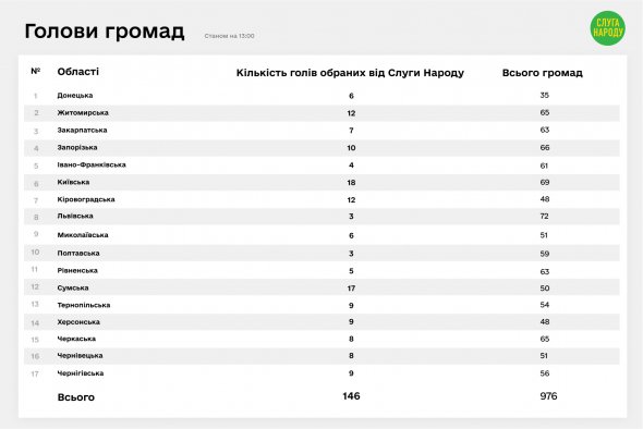 Також "Слуга Народу" в 17 областях отримає 146 місць (15%) голів ОТГ (дані з решти областей ще не обраховані).