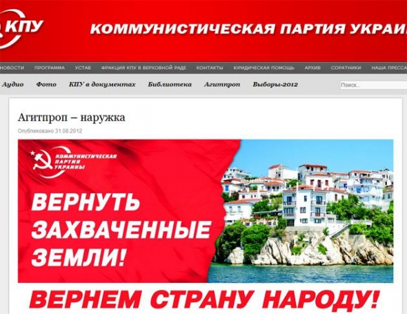 Комуністична партія України використовує у своїй зовнішній рекламі фотографію багатого на вигляд поселення на березі моря з припискою "Повернути захоплені землі!" Рекламний банер розміщується на білбордах і лайтбоксах, він також представлений на офіційному сайті КПУ. При цьому на самій фотографії зображений не Крим чи якийсь інший український курортний регіон, як, напевно, хотіли показати комуністи, а грецький острів Скіатос.