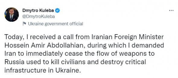 "Вимагав від Ірану негайно припинити потік зброї в Росію, яку використовують для вбивства мирних жителів і руйнування критичної інфраструктури в Україні", – повідомив Кулеба.