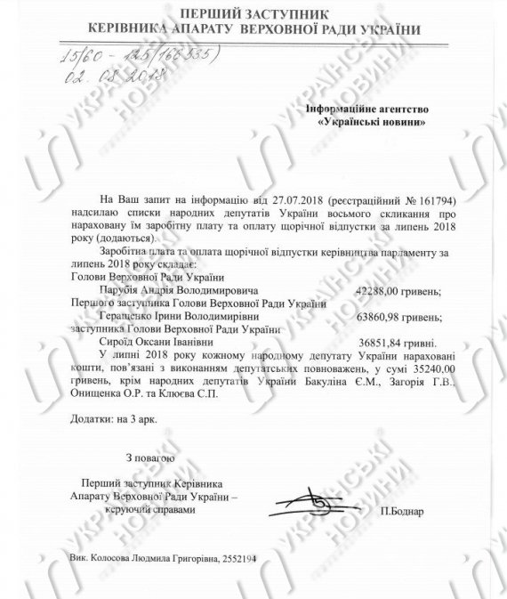 Голова Верховної Ради Андрій Парубій заробив за липень 42,3 тис. грн. Перший віце-спікер Ірина Геращенко отримала в липні 63 860,98 грн, а заступник голови ВР Оксана Сироїд - 36 851,84 грн.