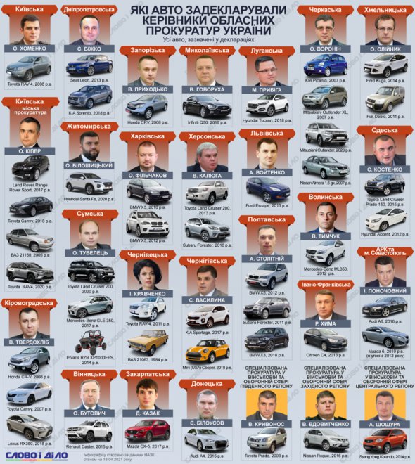 Автомобілі керівників прокуратур показали в інфографіці. Її опублікував портал "Слово і діло"
