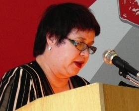 Представниця КПУ розпочала спіч російською мовою відразу після виступу англомовного промовця Йєнса Баммеля, генерального секретаря Асамблеї міжнародної асоціації видавців.
