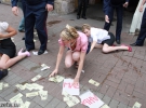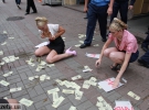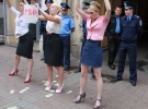 В понеділок зранку до Печерського суду Києва підходять три активістки руху "Фемен". На них чорні спідниці та світлі блузки, на голові - коса бубликом, як у Юлії Тимошенко. Міліціонери заступають їм дорогу. Дівчата рвуть на грудях блузки, міліціонери хапають їх під руки і намагаються відтягнути в сторону.