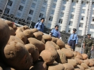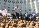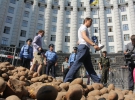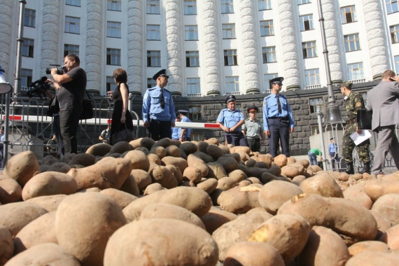 "Ми з однодумцями провели під стінами Кабінету міністрів акцію протесту на захист національного виробника. На акцію до будівлі Кабміну я привіз півтони вітчизняної картоплі. Минулої неділі спілкувався з людьми на базарі у місті Козелець Чернігівської області. Селяни розповіли мені, як їм важко жити. 83-річна жінка зі сльозами на очах розказала, що не може продати вирощену власноруч картоплю, якої у неї півтони, навіть по ціні 30 копійок за кілограм. Я викупив всю цю картоплю по гривні за кілограм і привіз її до уряду", - написав Ляшко.