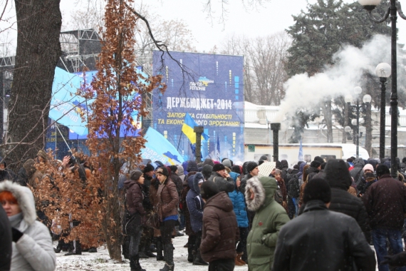 Люди приїхали мітингувати у столичний Маріїнський парк на підтримку партії регіонів, оскільки переживають, що їм не виплачуватимуть соцвиплати та зарплати. Тому мітингувальники вимагають затвердити бюджет на 2014 рік.