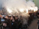 Посеред колони 10 людей несуть триметровий червоно-чорний стяг.