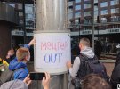 На колону приклеїли напис "Мецгер out". Журналісти також вимагають швидкого та об'єктивного розслідування дій голови правління банку.