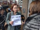 Люди тримали листівки з низкою статей Кримінального кодексу - Перешкоджання законній професійній діяльності журналістів, незаконне позбавлення волі, грабіж, погроза або насильство щодо журналіста.