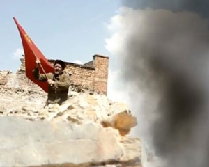 Півторихвилинний сюжет цього відео, в якому радянський солдат, рятуючи дитину, "вирубує" ворога лопатою, викурює сигарету, а потім піднімає червоний прапор, змонтований з відеозаписом привітання Олексія Костусєва.