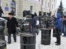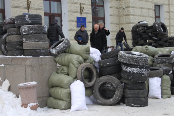 23 січня хмельницькі майданівці перейшли до дій. До головної площі області автівками стали підвозити старі шини. Наразі активісти обкладають вхід до облдержадміністрації. Де не вистачає шин перегороджують мішками зі снігом.