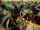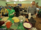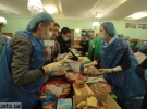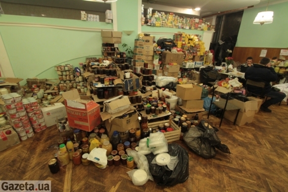"Складно порахувати, скільки йде хліба на добу. Але дуже багато. От сьогодні в нас тут була просто гора хліба і така ж гора лимонів. Все це приносять кияни. Ще багато приносять печива, меду, сала, варення і чаю. В нас є будь-які чаї зараз, он ціла виставка. Далі йдуть м'ясні та сирні нарізки, курятина, крупи різні і закрутки. Дівчата за ці дні на кухні навчилися роботи які хочете бутерброди. Наприклад, перемелюють сало і намащують хліб. Зверху огірок і готово", - каже волонтер Сергій.