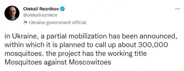 "В Україні оголошено часткову мобілізацію, в рамках якої планується призвати близько 300 тисяч комарів. Проєкт має робочу назву "Москіти проти московитів", – написав Резніков.
