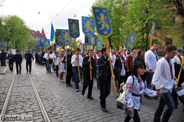 Це були переважно представники Конгресу українських націоналістів, Української народної партії, Народного руху України та різних громадських організацій. Учасники маршу тримали у руках жовто-сині та червоно-чорні стяги. Під час акції вони скандували: "Слава Україні! Героям Слава" та "Слава дивізії "Галичина"! Навіки слава!".