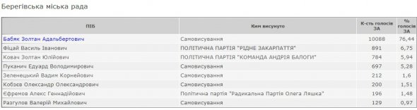 Також на виборах очільника Берегівської міської ради переміг Бабяк Золтан Адальбертович, чинний міський голова, йдеться на сайті Центральної виборчої комісії.