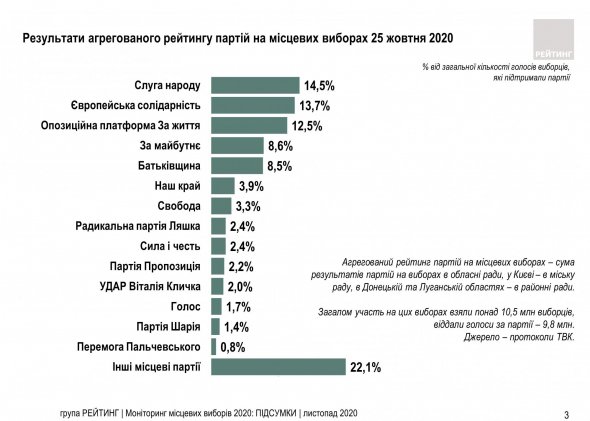 Умовний бар'єр у 5% на місцевих виборах подолали партії "Слуга народу" - 14,5%, "Європейська солідарність" - 13,7%, "Опозиційна платформа - За життя" - 12,5%, "За майбутнє" - 8,6%, "Батьківщина" - 8,5%.