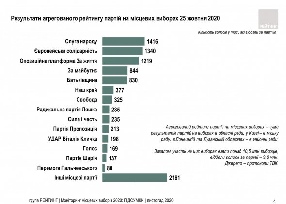 Відсотки розраховані від загальної кількості голосів виборців, які підтримали партії, повідомляє соціологічна група "Рейтинг".