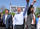 Люди також тримають таблички з назвами районів Київа та Київської област. Вони скандують "Банду — геть", "Юлі — волю" та співають гімн України.