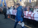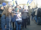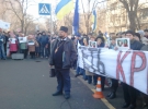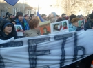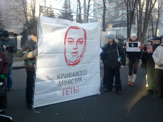 Мітингарі тримають у руках фотографії побитої вчора вночі журналістки Тетяни Чорновол та скандують: "Геть кривавого міністра!" та "Захарченка - геть!".