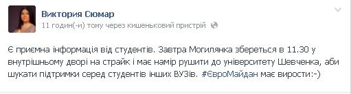 Вони мають намір пройти маршем від будівлі академії до університету ім. Тараса Шевченка. Студенти шукатимуть підтримки інших вишів, написала у своєму Facebook журналістка Вікторія Сюмар.