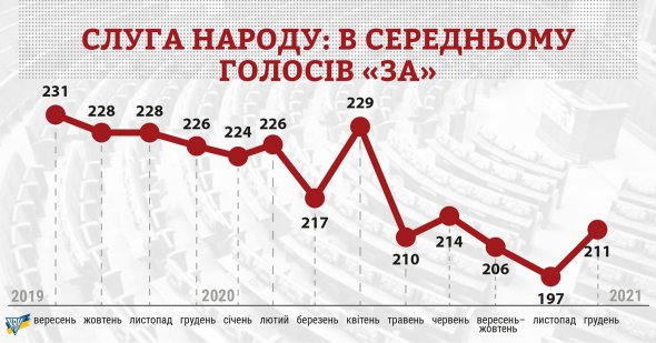 Показники голосувань владної фракції постійно знижуються. Якщо у вересні 2019 року за закони в середньому голосував 231 "слуга", то цьогоріч у вересні – 206, а в грудні - 211.