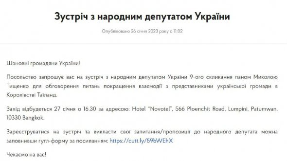 "Посольство запрошує на зустріч з народним депутатом України дев'ятого скликання Миколою Тищенком для обговорення питань покращення взаємодії з представниками української громади в Королівстві Таїланд", – ідеться в анонсі.