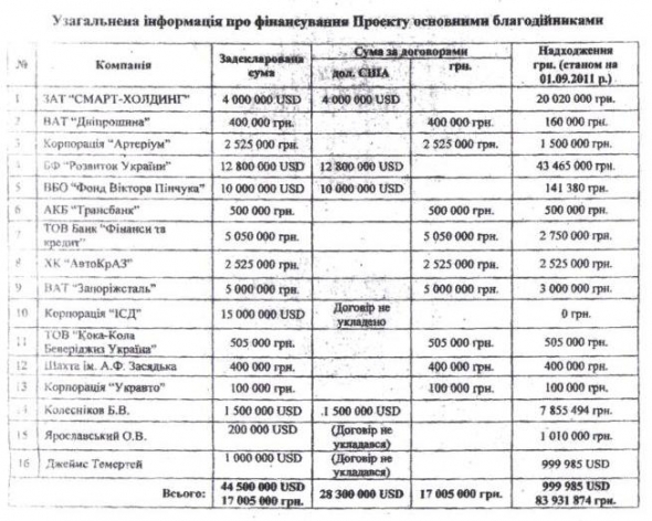 "Оприлюднюю перший документ щодо політичної корупції президента Віктора Ющенка. Надаю для ознайомлення громадськості та НАБУ узагальнену інформацію про фінансування "Лікарні майбутнього" крупним бізнесом, тодішніми опозиційними політиками та різними фондами. Загальна сума отриманих грошей – 44,5 мільйона доларів і понад 17 мільйонів гривень (у період правління Ющенка курс гривні до долара був спочатку 5, а потім 8 гривень)", - написав він.