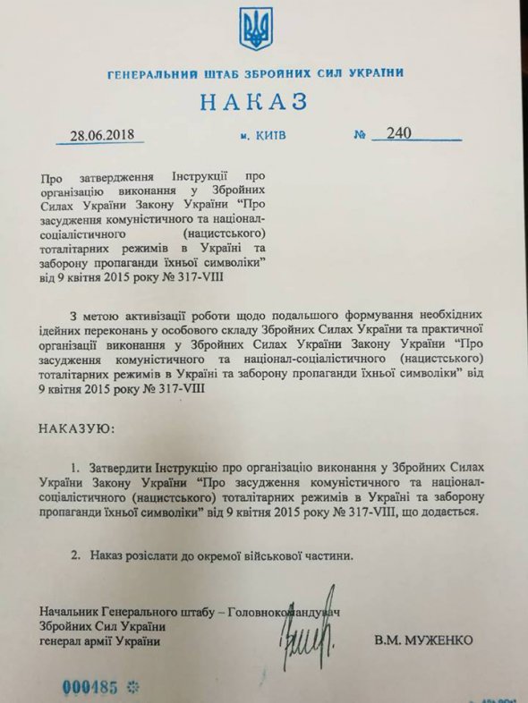 Начальник Генштабу ЗСУ Віктор Муженко підписав наказ про виконання командирами всіх рівнів управління закону "Про засудження комуністичного та націонал-соціалістичного (нацистського) тоталітарних режимів в Україні та заборону їхньої символіки".