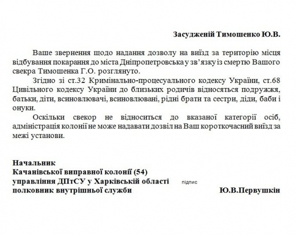 У відповідь на письмове звернення Юлії Тимошенко з проханням про короткочасному виїзді за межі установи і ЦКБ "Укрзалізниці" ДПтС надала мотивовану письмову відмову з посиланням на норми чинного законодавства.