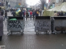 На столичному майдані Незалежності двоє хлопців фотографуються біля сміттєвих баків, де балончиком хтось з мітингувальників написав: "Хата Яника", "Азаров, повертайся у Росію".