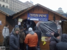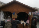 У дерев'яних будиночках, які призначалися для різдвяного ярмарку, киянка Людмила сортує жіночий одяг. Його на Майдан зносять кияни. Горою накидані гольфи і теплі светри, на столі складені нові шкарпетки і рукавиці.