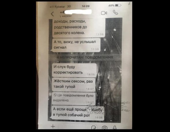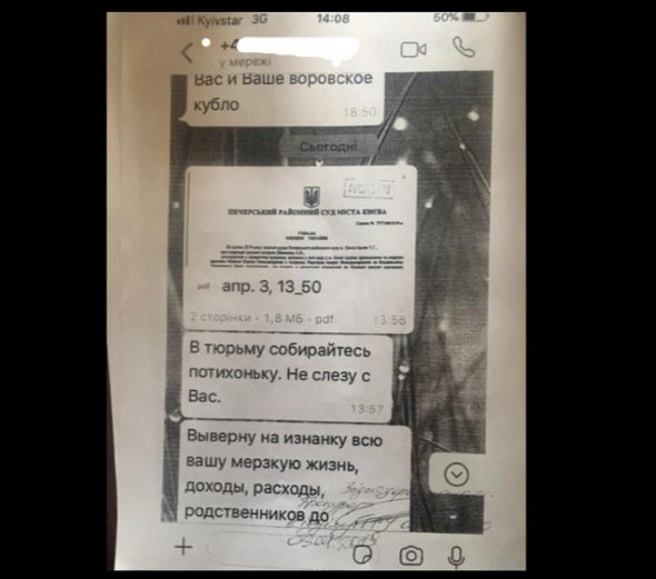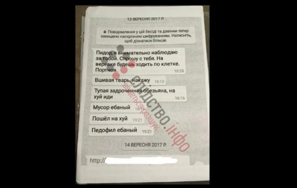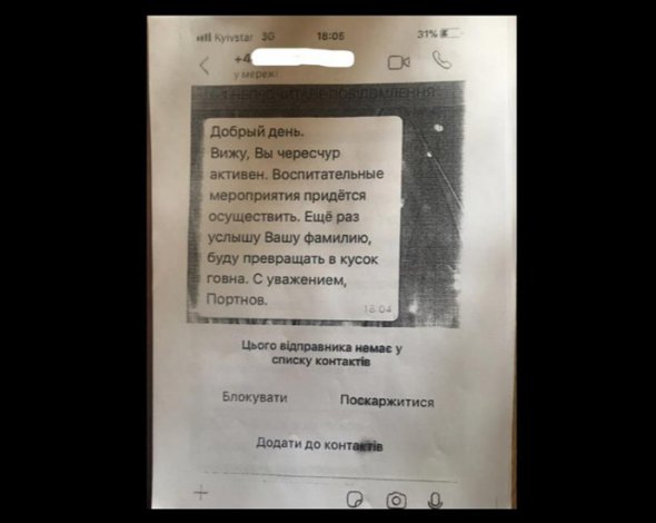 Зокрема, у 2017 році отримав повідомлення: "Я тебе в клітці возитиму і показуватиму наче мавпу. Я тобі пишу, щоб ти знав, що у мене претензії саме до тебе. Щоб ти знав, що спитаю саме з тебе. Час твій закінчується, а питати з тебе я буду дуже жорстко".