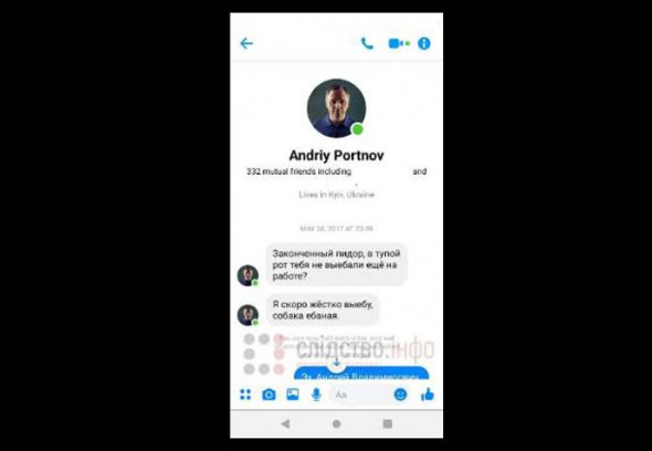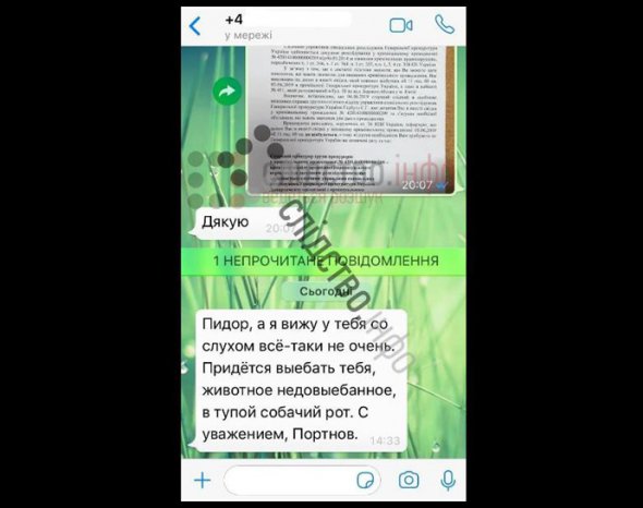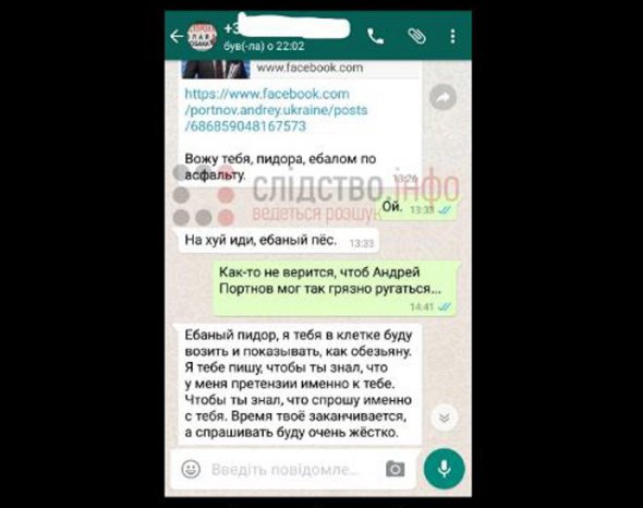 Два роки тому у вересні, слідчий отримав таке повідомлення: "П…р, я уважно спостерігаю за тобою. Спитаю з тебе. На мотузці будеш ходити по клітці. Портнов".